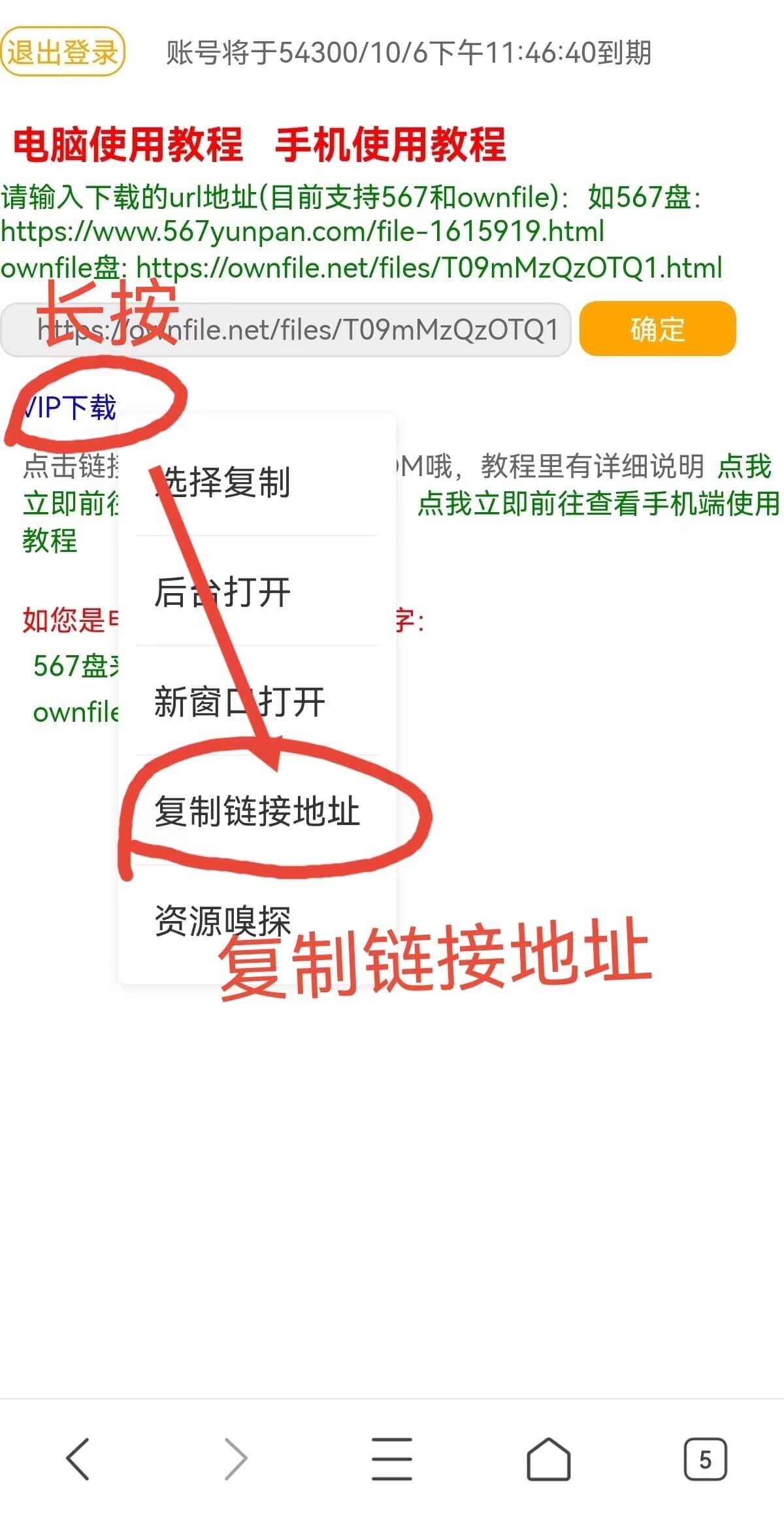(7)回到浏览器,继续长按你当前网盘的对应的来源页,选择复制链接地址