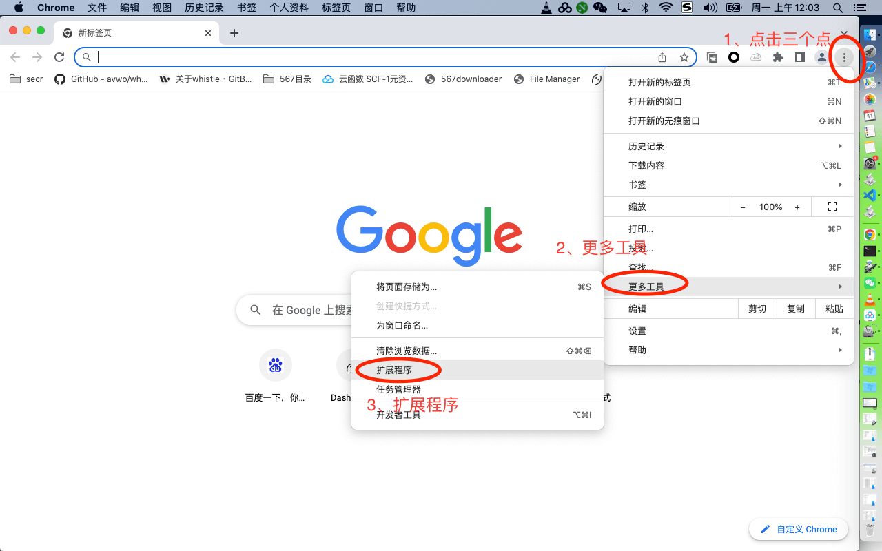 (2)打开谷歌浏览器,按下图操作进入浏览器扩展控制台